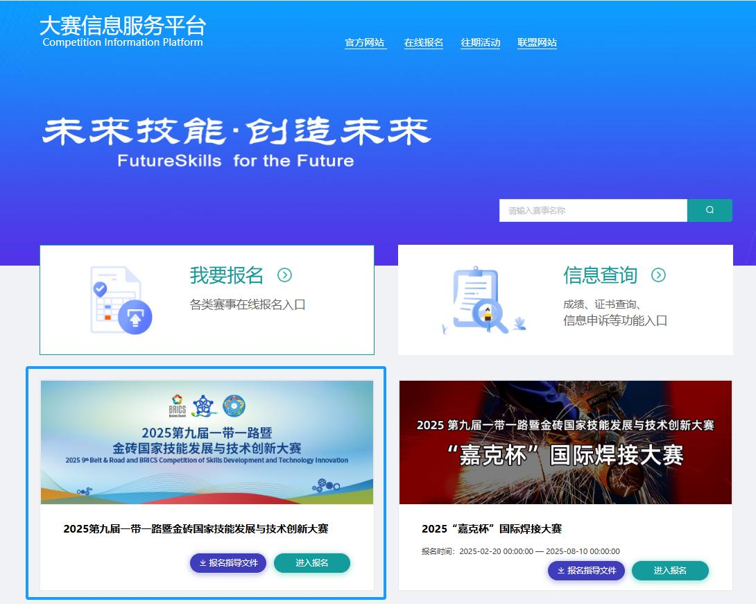 1. 校内报名:教师和参赛成员需在指定时间内(10月10日前),登录官网https://www.bricsacademy.org.cn/signup/index ,选择【2025第九届一带一路暨金砖国家技能发展与技术创新大赛】报名入口,完成报名。