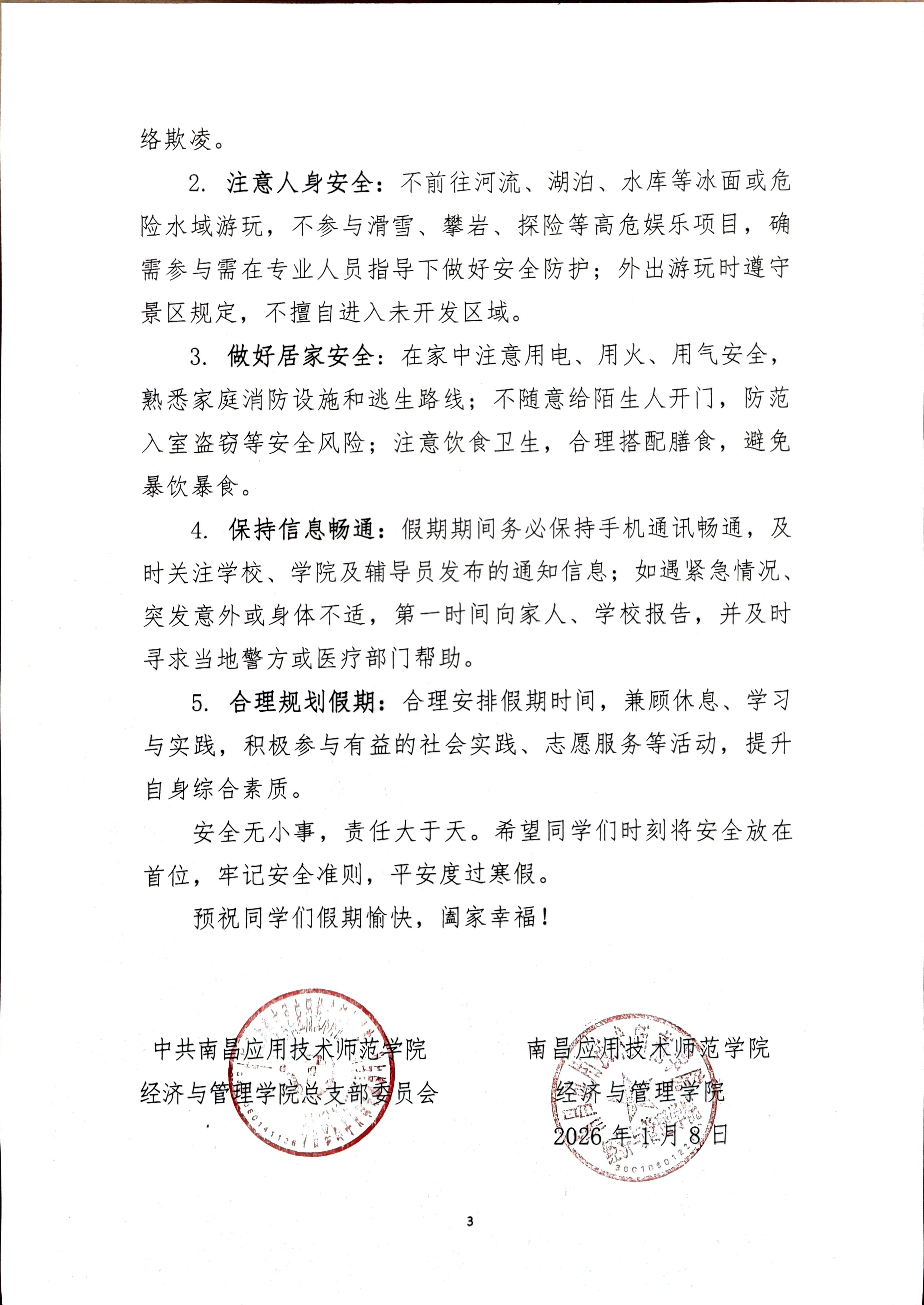 首页栏目 综合新闻 通知公告 学生工作 您现在的位置是:首页 > 首页栏目 > 通知公告 永利集团官网学生假期安全告知书 管理员2026-01-08697 上一篇 关于拟将华荣同志转为正式党员的公示 下一篇 关于永利集团官网拟推荐申报校级五四红旗团支部、优秀共青团员、优秀志愿者名单的公示